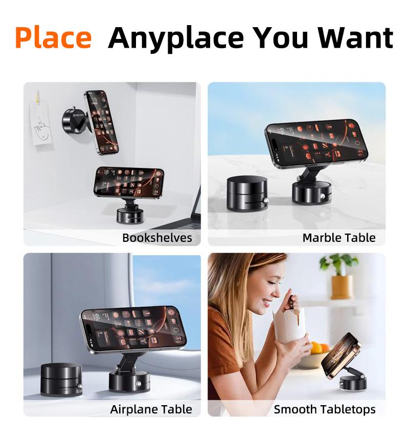 - Strong Vacuum Suction & StabilityEquipped with a vacuum suction cup, this bracket adheres securely to any smooth surface without falling off. It can support up to 10 kg, making it perfect for holding your phone or other small items.